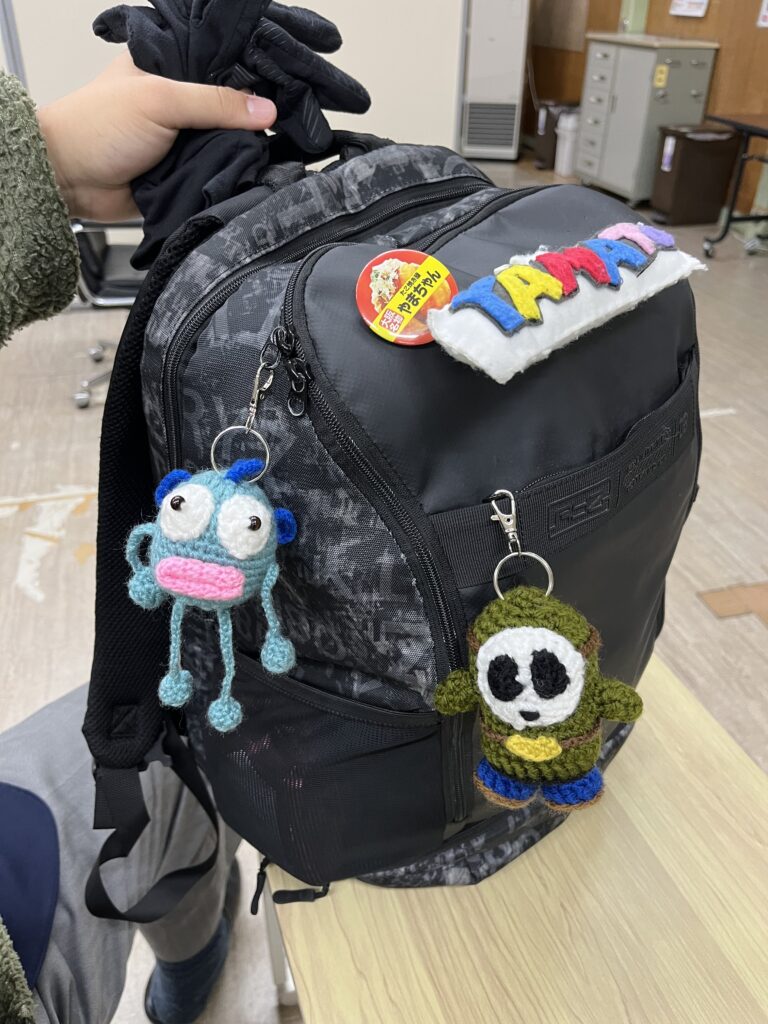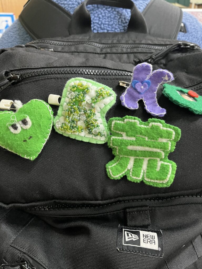 次は好きな色なのでしょうか緑の手作りマスコットがかわいいリュックと