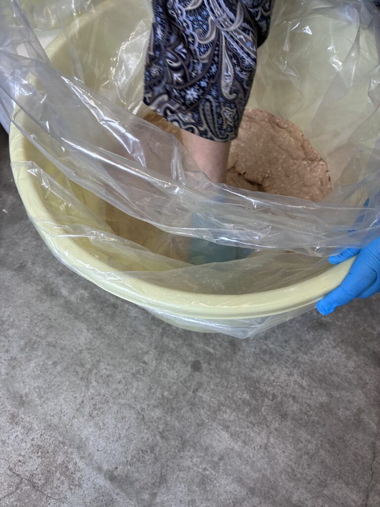 そして大豆とお塩と麹を混ぜたものを空気を抜きながら樽に詰めている所です
