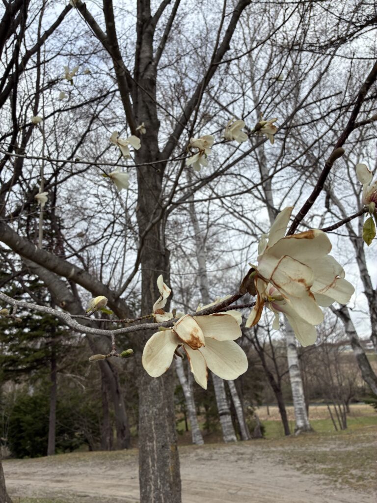 その近くにはこぶしが咲いていましたがもう花のふちの方が茶色くなってきていました